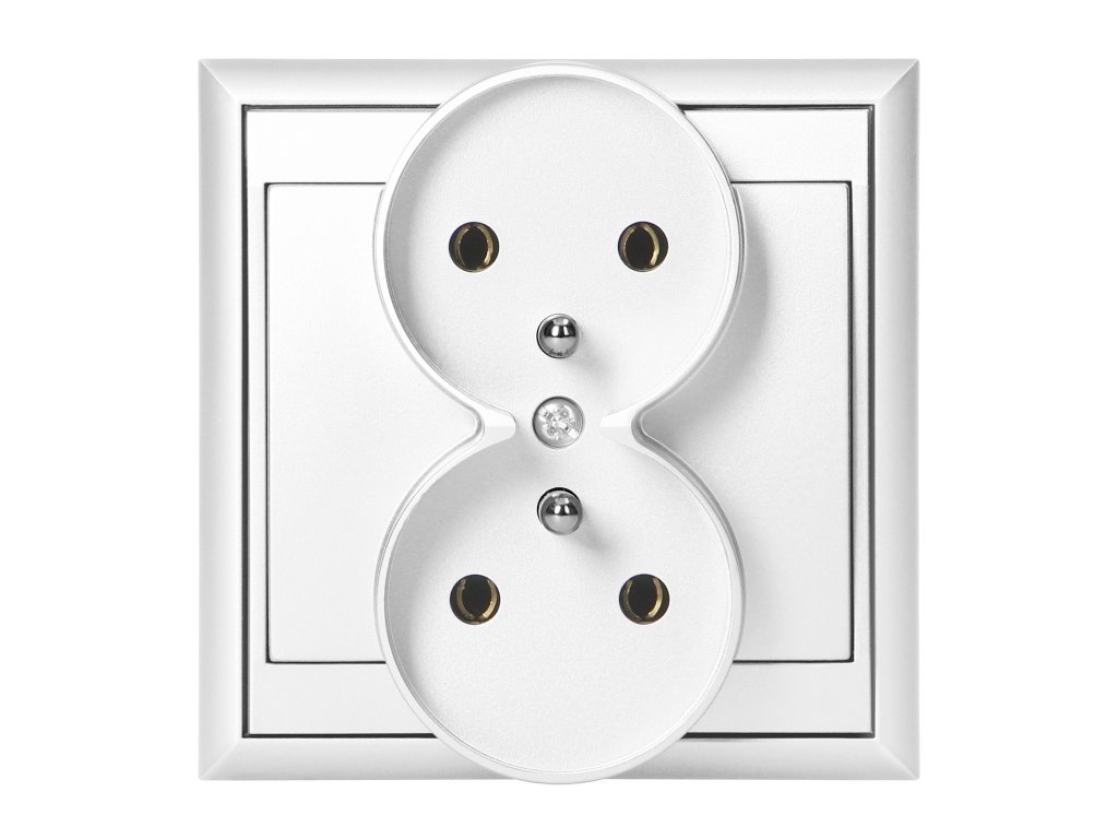 Dupla francia típusú aljzat, 2x2P+E. Kifejezetten keretlaptáblás rendszerben történő süllyesztett felszerelésre tervezve. Beltéri használatra készült (IP20).