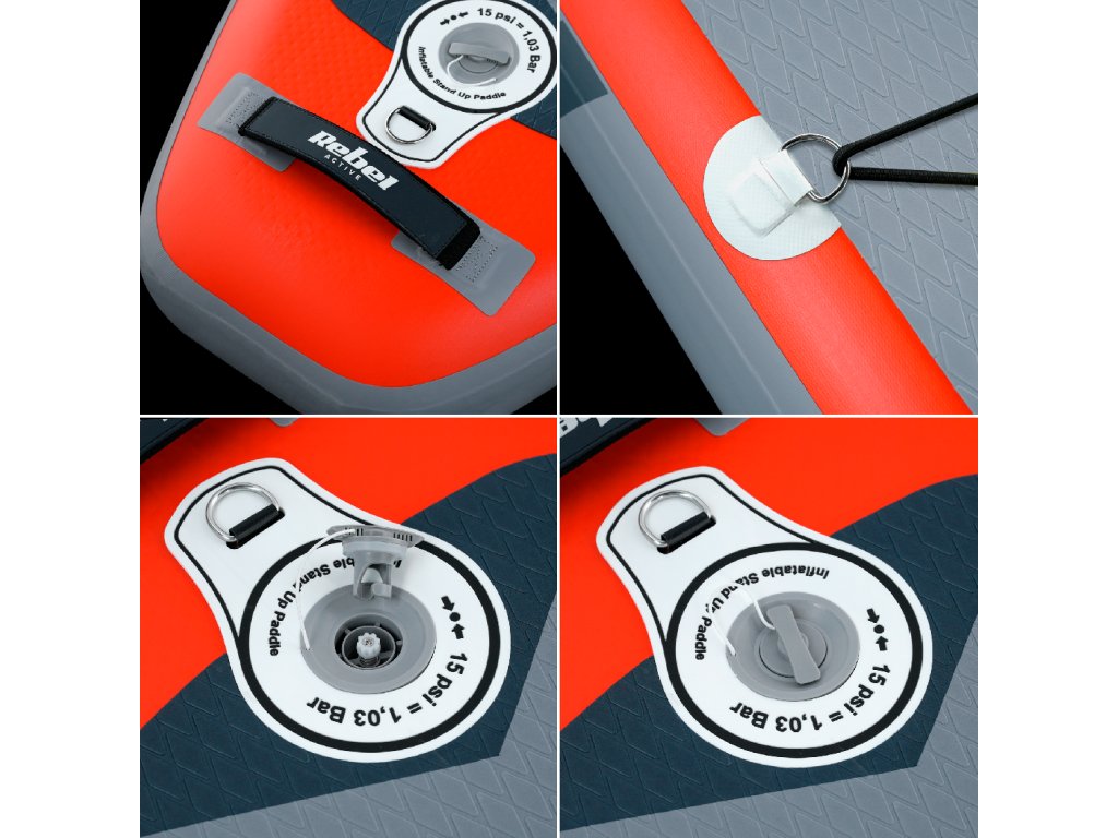 A két - középső és hátsó - hordozófogantyúnak köszönhetően a Rebel Active SUP deszka szállítása a parton egyszerű és kényelmes. Az orron található rögzítőkötéllel ellátott integrált poggyászfogantyúk viszont lehetővé teszik a szükséges holmik biztonságos szállítását a vízi kalandok során.