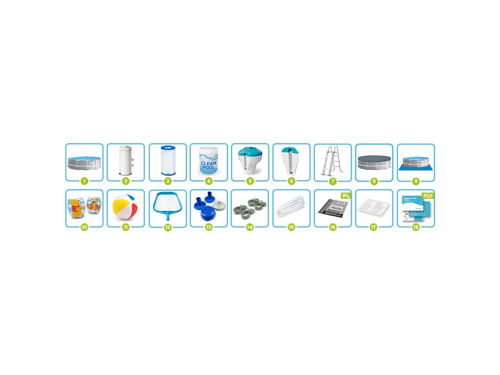 Elkészített készlet teljes felszereléssel – nem kell az összes elemet külön keresnie. INTEX medence speciális kiegészítőkkel