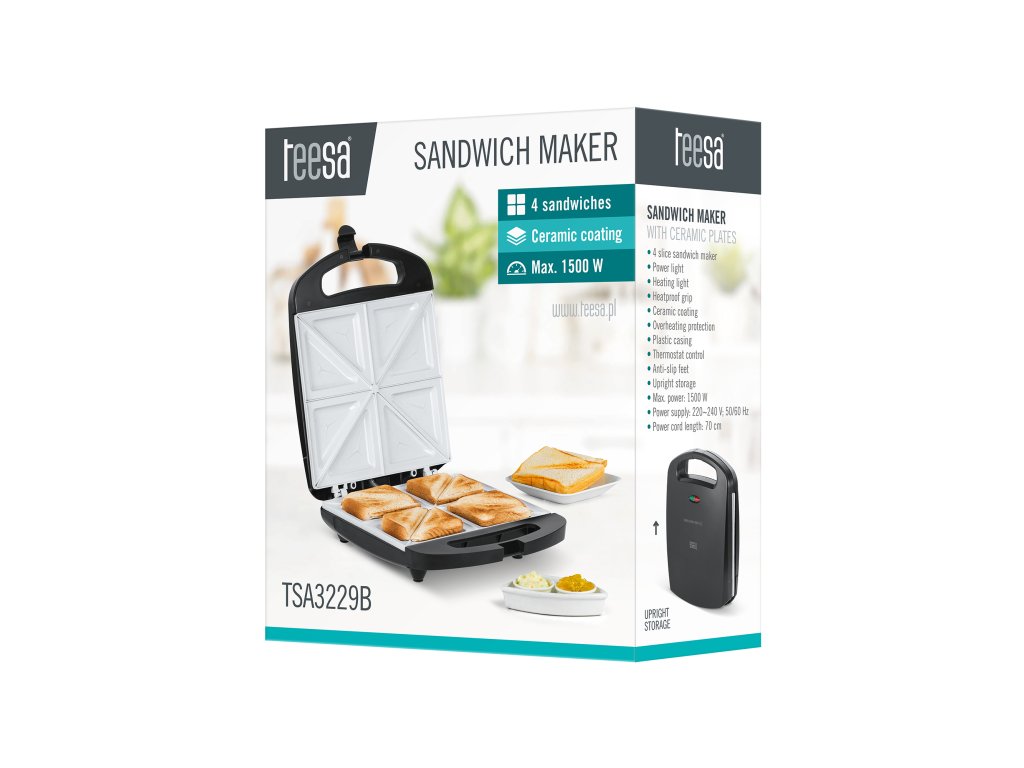 Mindig azt szeretné, hogy a kenyere ropogós legyen? Vagy csak szeretné feldobni az ételeit? Próbálja ki még ma a Teesa TSA3229 kenyérpirítót, és soha többé nem akar majd visszatérni a klasszikus szendvicsekhez! A készülékkel egyszerre négy pirítóst készíthet, és nagy, 1500 W-os teljesítményének köszönhetően hihetetlenül gyorsan felmelegszik. Ez azt jelenti, hogy pillanatok alatt elkészítheti a reggelit az egész családnak. Örülni fog annak is, hogy a kenyérpirító tapadásmentes kerámia bevonatú lemezekkel rendelkezik, így biztos lehet benne, hogy nem fog időt pazarolni a hosszadalmas takarítással.
