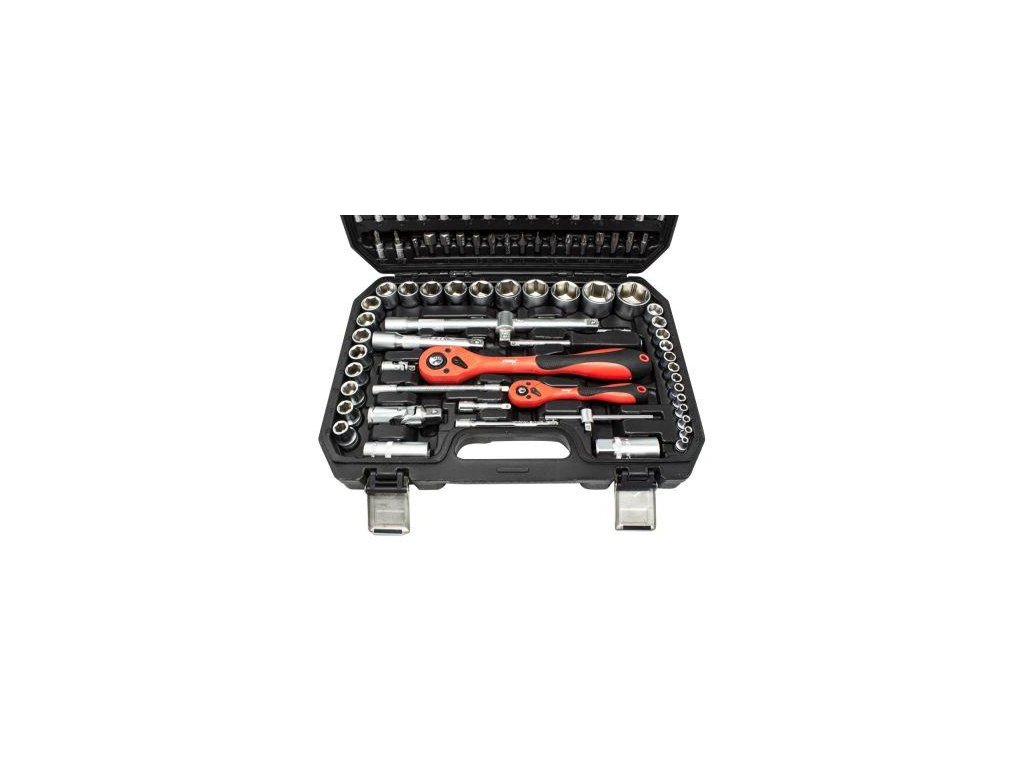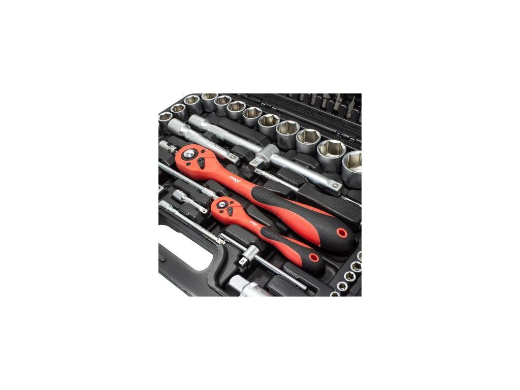 A készlet tartalmaz professzionális ratchet mechanizmusokat, amelyek erős és precíz 72 fogas mechanizmusra épülnek, és nagy terhek átvitelére szolgálnak. Magas minőségű króm-vanádium acélból készültek, műanyag bevonattal. A ratchet-eket úgy tervezték, hogy megfeleljenek a legnehezebb körülmények között végzett intenzív munka követelményeinek. A kétkomponensű fogantyú kényelmet biztosít a munkához és biztos fogást, megkönnyítve a ratchet manőverezését. Az anyag szintén védi a festett bevonatokat a karcolásoktól. Magas minőségű CrV acél Segítség gomb a tartó leengedéséhez.
