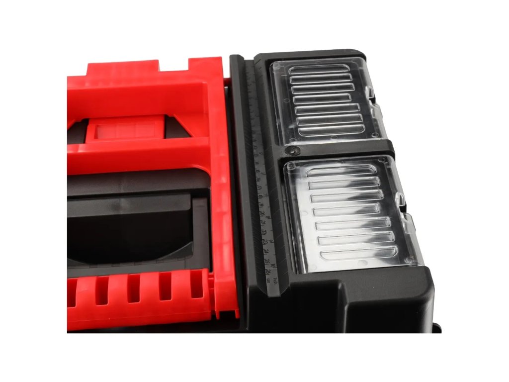 A felső szekrény tetején négy praktikus tárolórekesz található a kisebb szerelési tárgyak vagy kisebb szerszámok, például precíziós csavarhúzók, kis fogók, csavarhegyek számára. A kerekes műhelyt nem csak a nagy tárolóhely jellemzi. A DEDRA N0200 számos olyan praktikus funkcióval rendelkezik, amelyek első pillantásra talán nem tűnnek fel, de hosszabb használat után nagyon hasznosak lesznek, pl. a mélyedés alján található mérőeszköz, amelybe biztonságosan elhelyezhet egy munkadarabot, pl. egy csövet.