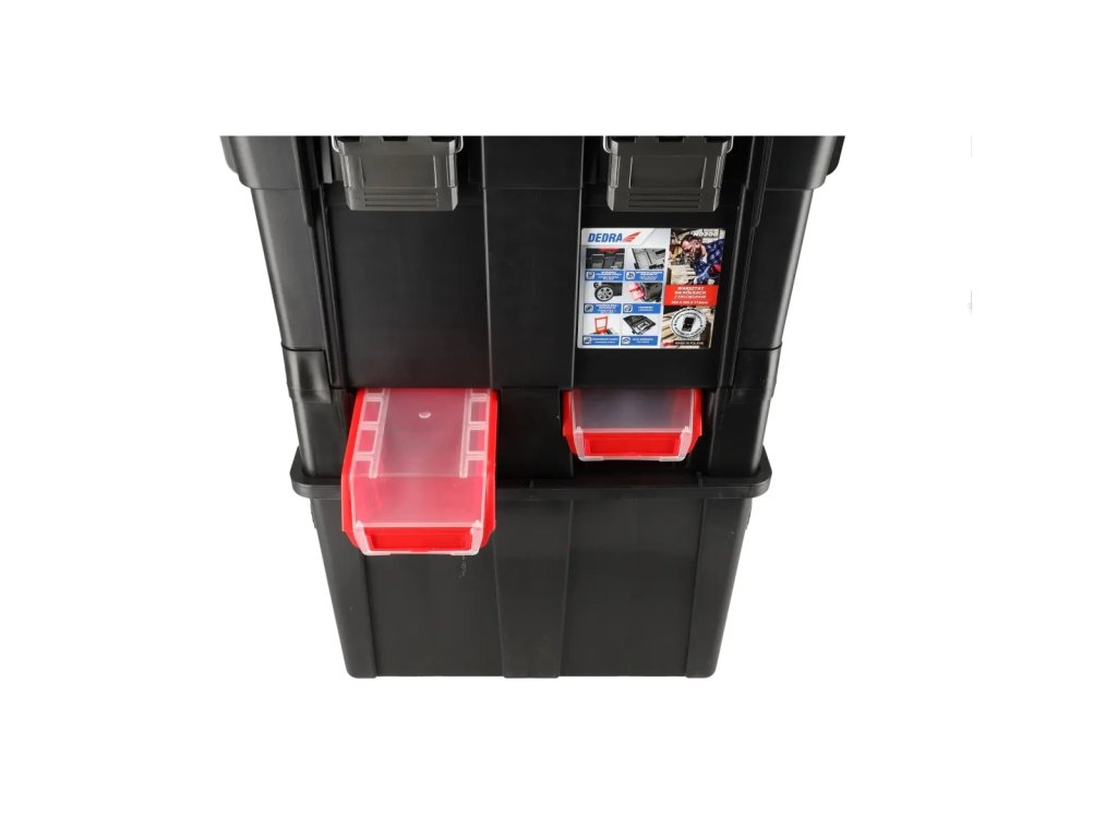 A DEDRA N0200 két fogantyúval van felszerelve. A középső a felső szekrény szállításakor segít. A doboz szélén található nagyobb, piros színű fogantyú lehetővé teszi a dobozegység biztonságos és kényelmes áthelyezését a beépített görgők segítségével. A fogantyú a könnyű használat érdekében egy csúszó reteszelő/kioldó mechanizmussal van rögzítve. A fogantyú csak akkor emelkedik fel, amikor Ön szeretné. Ez növeli a felhasználói kényelmet, miközben védi az elemet a véletlen sérülésektől. Az egész rendszer stabilitását masszív, fémálló poliamid lábak biztosítják. A dobozokat a sarkoknál csúszásmentes párnákkal rögzítik. Ez nemcsak további stabilitást biztosít, hanem csillapítja a rezgéseket a műhely kerekeken történő mozgatásakor, és megakadályozza a dobozok megcsúszását szállítás közben, pl. az autóban.
