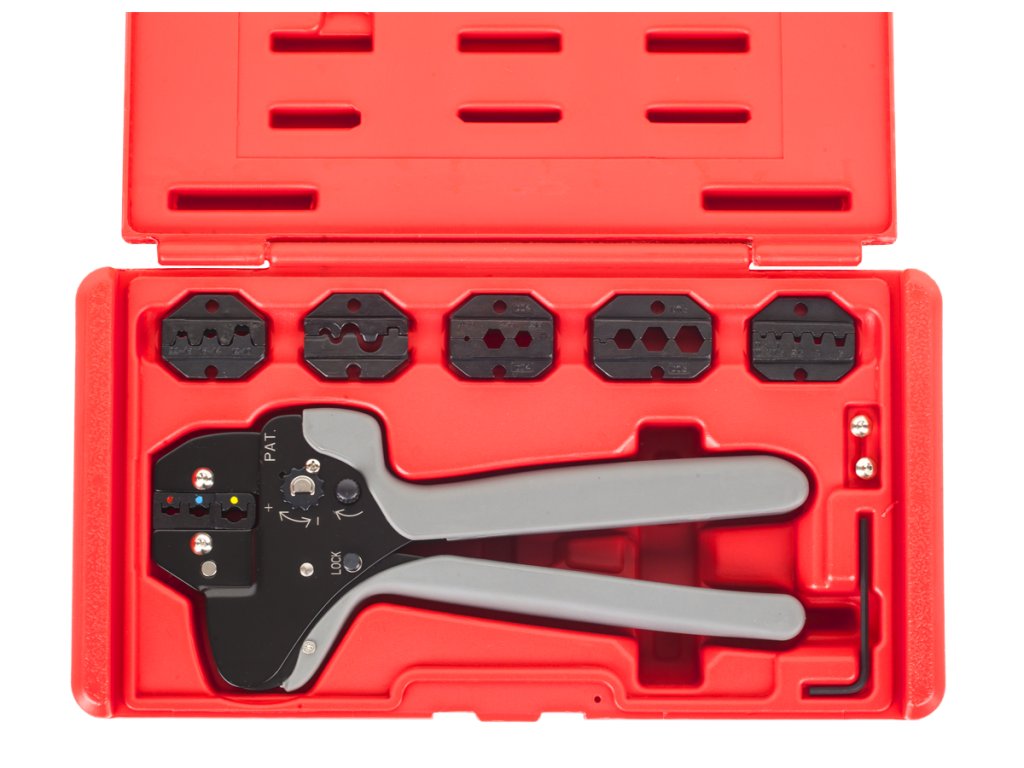 7 darabos készlet praktikus bőröndben A készlet tartalmaz egy csatlakozószorítót 6 cserélhető betéttel7 darabos készlet praktikus bőröndben