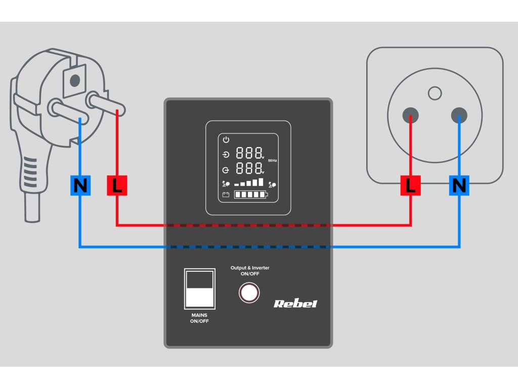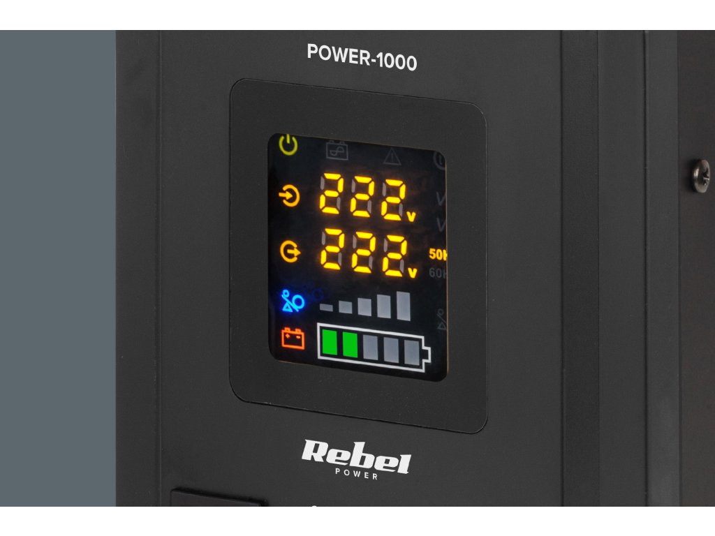 A szünetmentes Rebel forrás kényelmes használatát a tiszta LED kijelző garantálja. Ennek köszönhetően könnyedén leolvashatja a készülék aktuális működési állapotát, ellenőrizheti többek között: bemeneti feszültséget, kimeneti feszültséget és frekvenciát. Ezenkívül gyorsan ellenőrizheti a terhelési szintet és az akkumulátor töltöttségi szintjét.