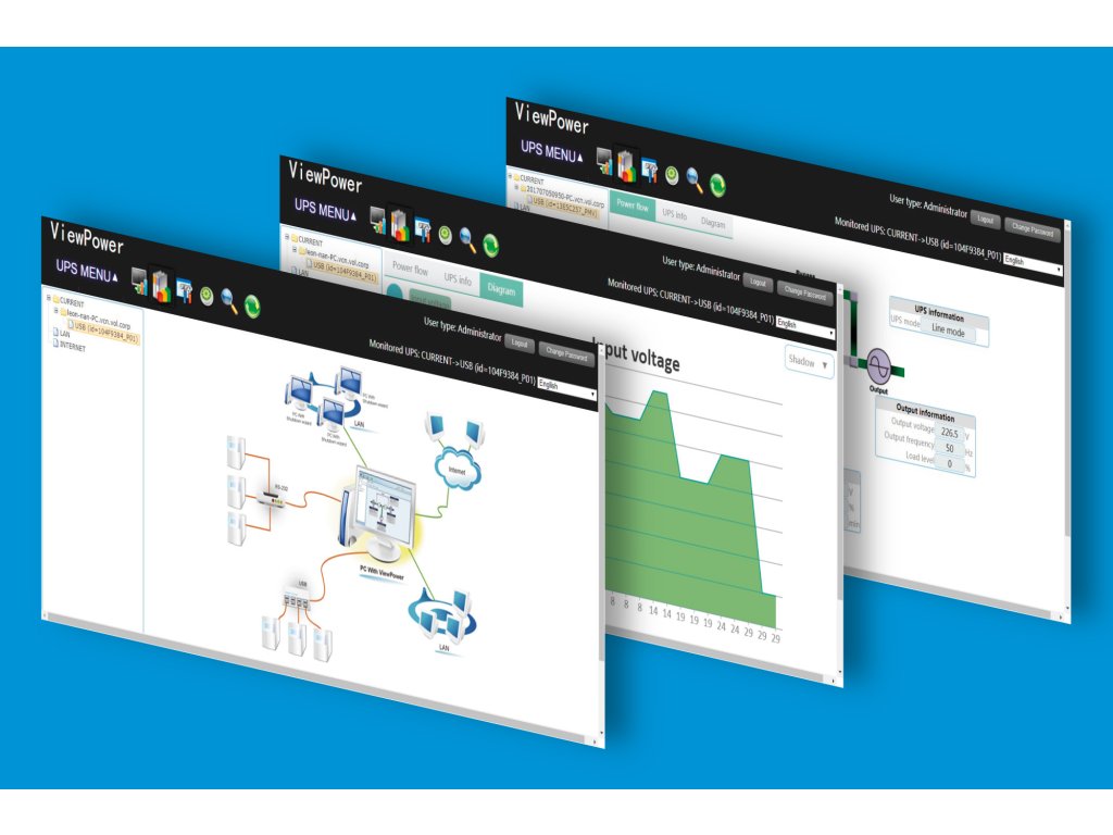ARebel RB-4023 UPS-t a ViewPowerHTML szoftver segítségével is kezelheti. Ez lehetővé teszi, hogy távolról ne csak egy, hanem akár több UPS-t is felügyelhessen hálózatos környezetben, LAN-on vagy interneten keresztül.Az alkalmazásban történő kezelésük megvédi Önt az áramkimaradás miatti adatvesztéstől, valamint biztonságosan leállíthatja a rendszereket, mentheti a programadatokat és a tervezett áramkimaradásokat.