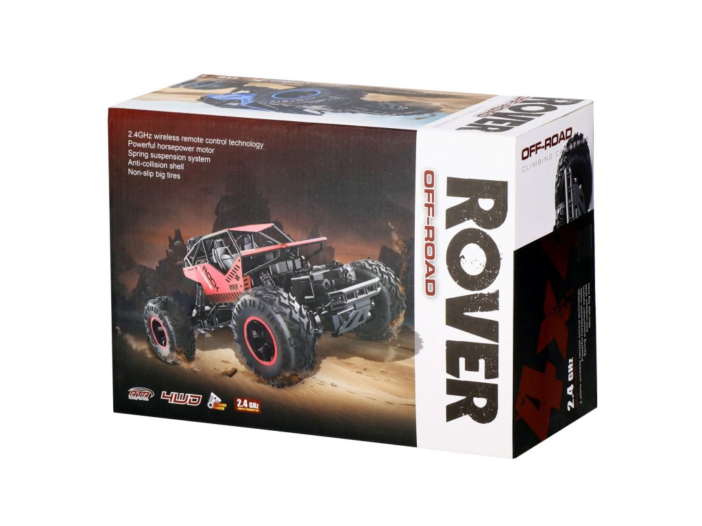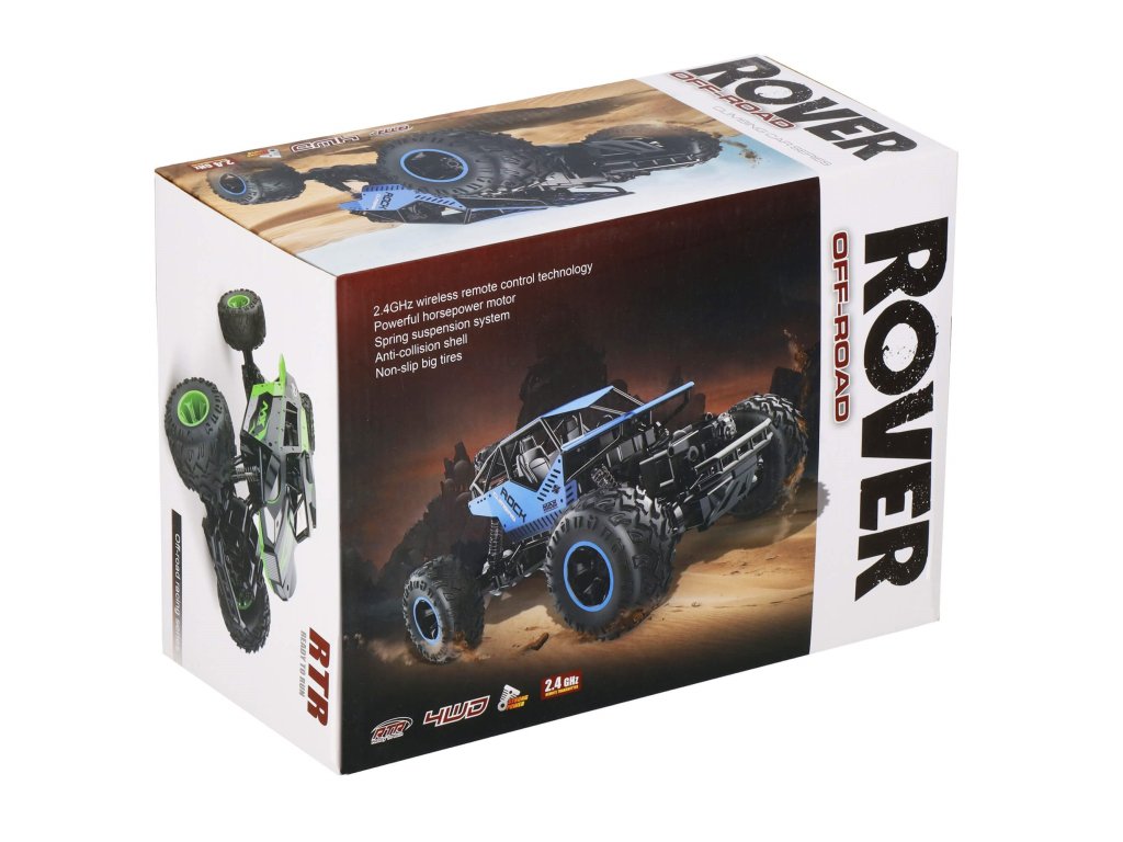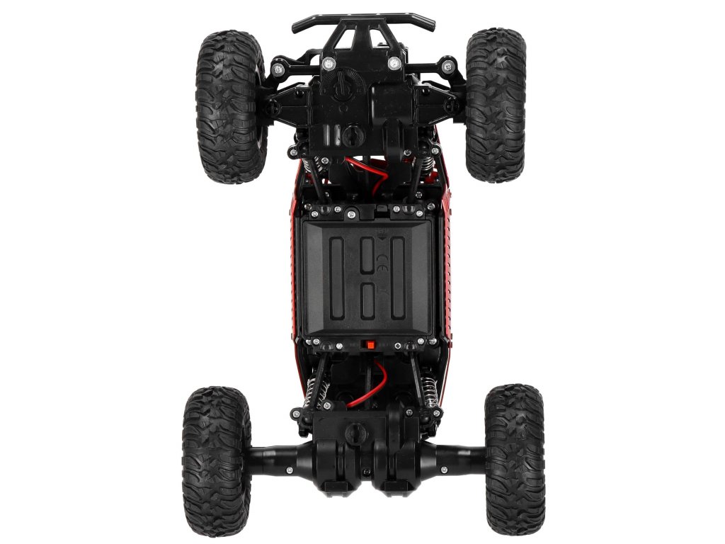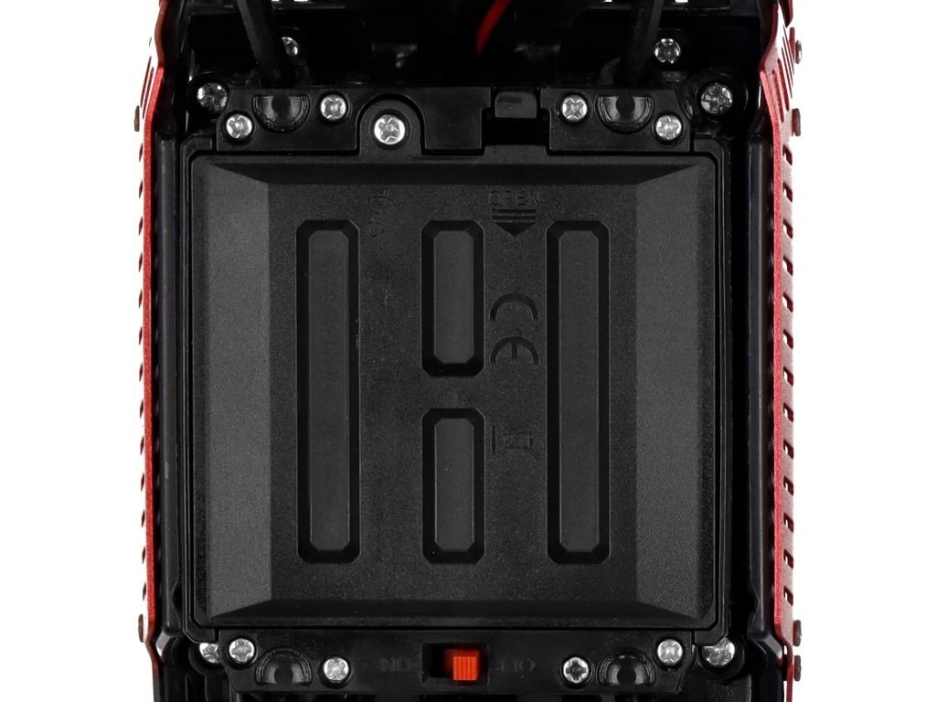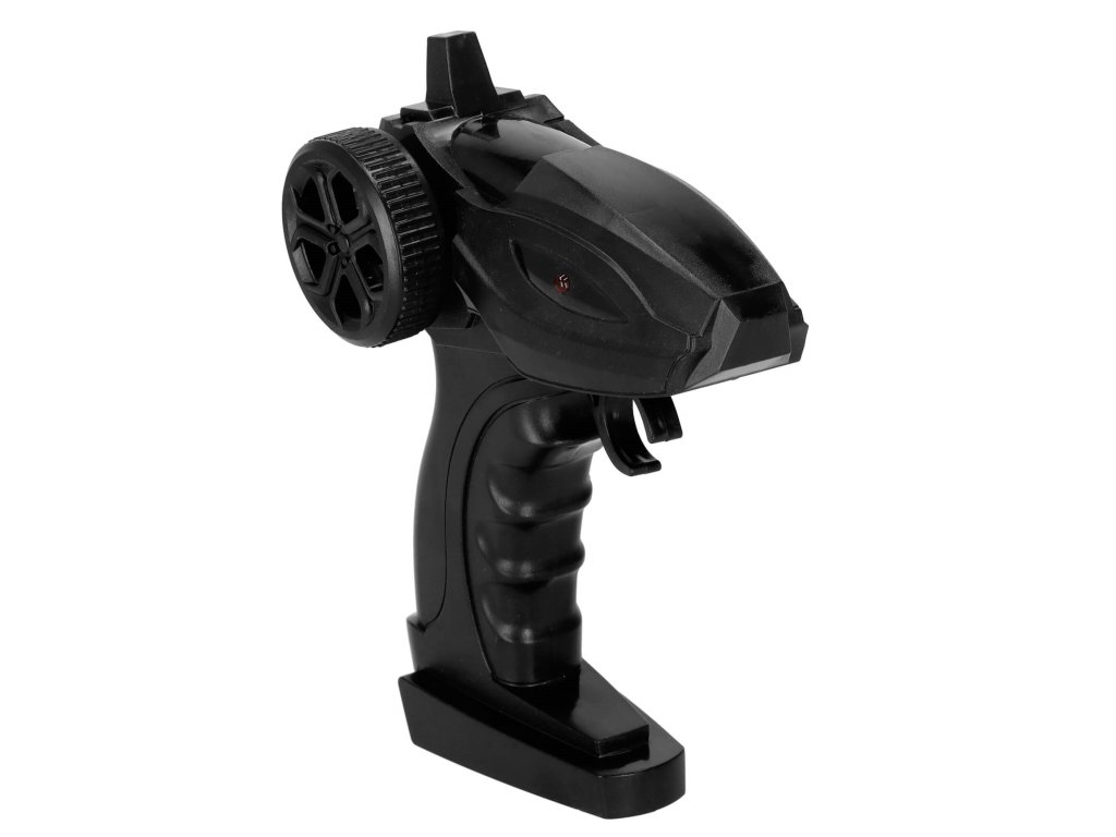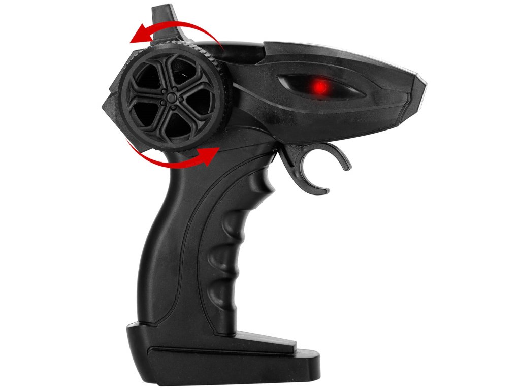 - A távirányító egy kapcsolóval, elembemenetekkel, a haladási utat (jobbra/balra) vezérlő kerékkel, a haladást (elöl/hátul) vezérlővel és egy piros diódával van felszerelve, amely az áramellátást jelzi