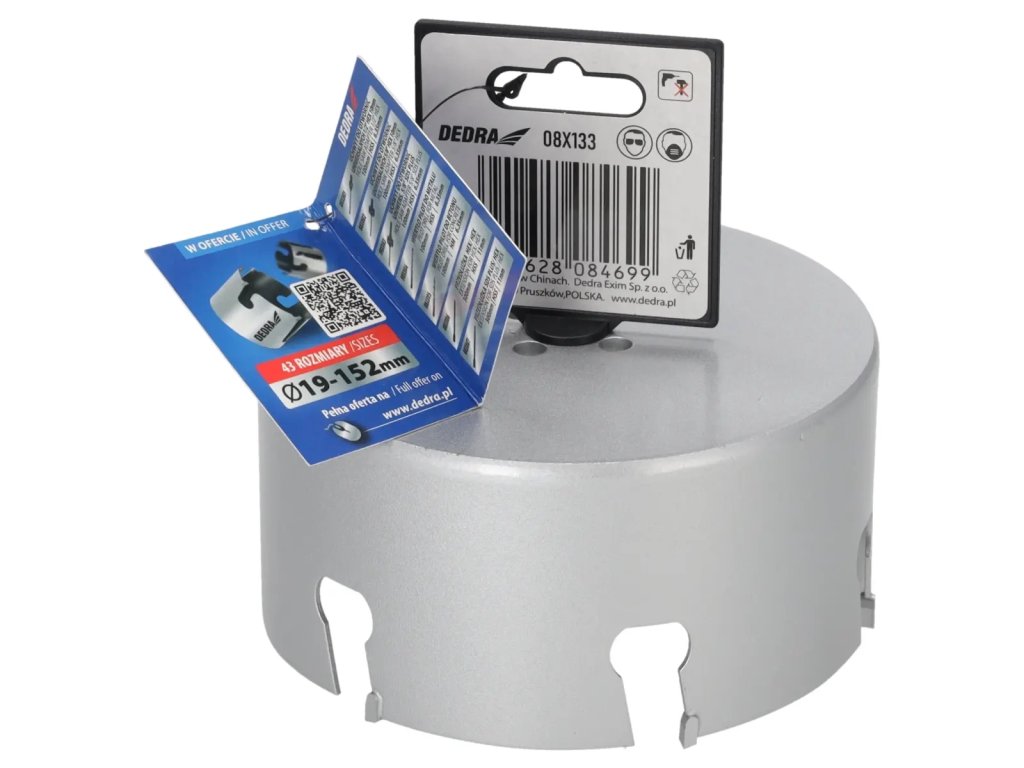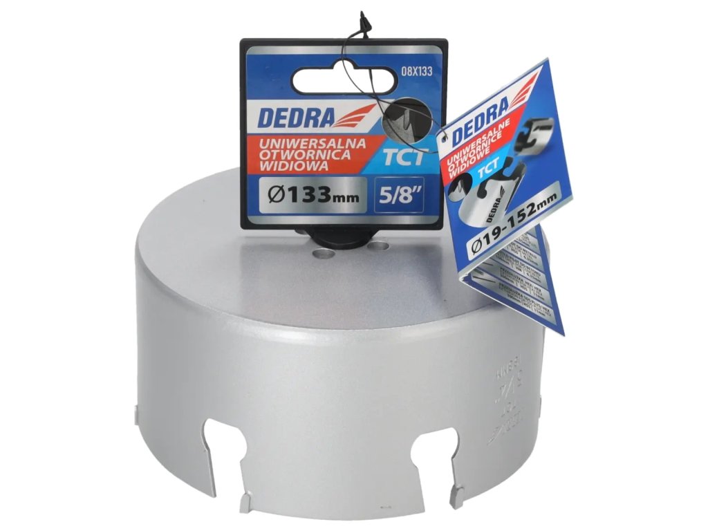 Azuniverzális lyukfűrész nélkülözhetetlen eszköz a barkácsműhelyben. A speciális vágóél kialakítás növeli a fűrész szilárdságát és javítja a furatvezetést. a HEX 10 mm-es 1 /2" tokmányok 08X001 (ajánlott furatokhoz: 08X019-08X030) és az 5/8" tokmányok 08X002 (ajánlott furatokhoz: 08X032-08X152) használatával a lyukfűrész fúrógépen vagy fúróprésen is használható.A 08X003 SDS+ tokmány 08X003 (ajánlott furatokhoz: 08X 032 -08X152) használatával a DEDRA 08 X széles körben elterjedt lyukfűrész használható felületi fúróval, csavar nélküli üzemmódban.A vágási hatás javítása és az erő növelése érdekében a furatok több villás betétet tartalmaznak, amelyek hatékonyan megmunkálják az anyagot. a DEDRA 08 X univerzális kísérleti fúrószárral fa, fém, bútorlapok, PVC, ásványi anyagok, például kerámialapok, pórusbeton és szilikátok megmunkálásához használható a megfelelő kísérleti fúrószár használatával.A furatok szilárdságának növelése érdekében a mag kiváló minőségű, 1,5 mm vastagságú HCS No. 45 acélból, a fogak pedig 6% kobaltot tartalmazó volfrámkarbidból (YG 6X volfrámacél) készülnek, ami javítja a fúrások minőségét és tartósságát, valamint növeli a fúrás hatékonyságát.