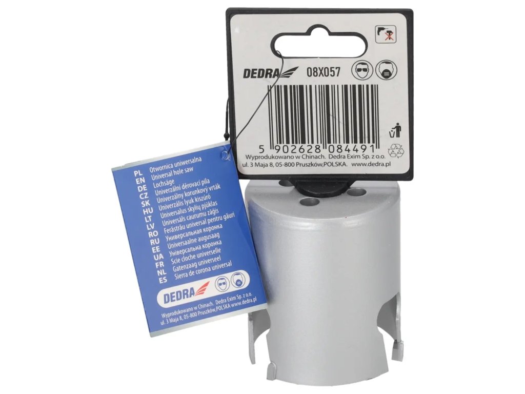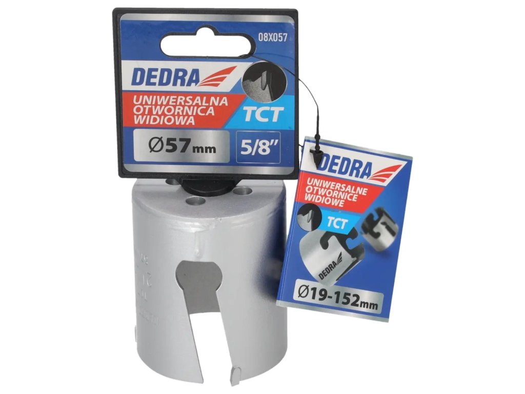 A tényleges méret a termékleírásban látható.Az univerzális lyukfűrész nélkülözhetetlen eszköz a barkácsműhelyben. A speciális vágóél kialakítás növeli a fűrész szilárdságát és javítja a furatvezetést. a HEX 10 mm-es 1 /2" 08X001 tokmányok (ajánlott furatokhoz: 08X019-08X030) és az 5/8" 08X002 tokmányok (ajánlott furatokhoz: 08X032-08X152) használatával a lyukfűrész fúrógépen vagy fúrógépen is használható.A 08X003 SDS+ tokmány (ajánlott furatokhoz: 08X 032 -08X152) használatával a DEDRA 08 X széles körben elterjedt lyukfűrész használható felületre szerelt fúróval, csavar nélküli üzemmódban.A vágóhatás javítása és az erő növelése érdekében a furatok több villás betétet tartalmaznak, amelyek hatékonyan megmunkálják az anyagot. a DEDRA 08 X univerzális kísérleti fúrószárral fában, fémekben, bútorlapokban, PVC-ben, ásványi anyagokban, például kerámialapokban, pórusbetonban és szilikátokban lehet dolgozni a megfelelő kísérleti fúrószár használatával.A furatok szilárdságának növelése érdekében a mag kiváló minőségű, 1,5 mm vastagságú HCS No. 45 acélból, a fogak pedig 6% kobaltot tartalmazó volfrámkarbidból (YG 6X volfrámacél) készülnek, ami javítja a fúrások minőségét és tartósságát, valamint növeli a fúrás hatékonyságát.