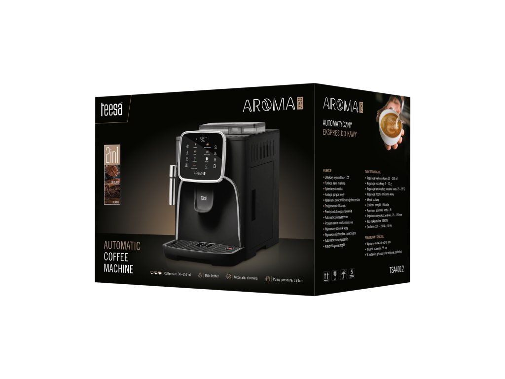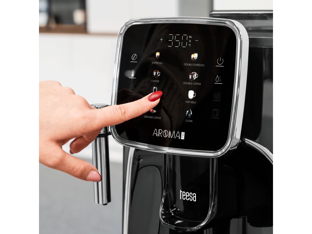 A modern érintőképernyős LCD kijelző rendkívül megkönnyíti a Teesa Aroma 750 kávéfőző használatát. Az intuitív felület lehetővé teszi az italok gyors kiválasztását és a paraméterek módosítását. Ez azt jelenti, hogy a tökéletes kávét akár kezdők is könnyedén elkészíthetik.