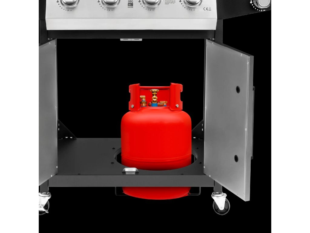 A Teesa BBQ 5007 MASTER grill tágas szekrénnyel rendelkezik, amely lehetővé teszi, hogy akár 11 kg kapacitású gázpalackot biztonságosan tároljon. Ennek köszönhetően a gáz rejtve marad, javítva a használat esztétikáját és biztonságát. A stabilítást biztosító rozsdamentes acélajtók könnyítik meg a hozzáférést, és a kerekeken történő stabil konstrukció kényelmes mozgatást tesz lehetővé a grill számára.