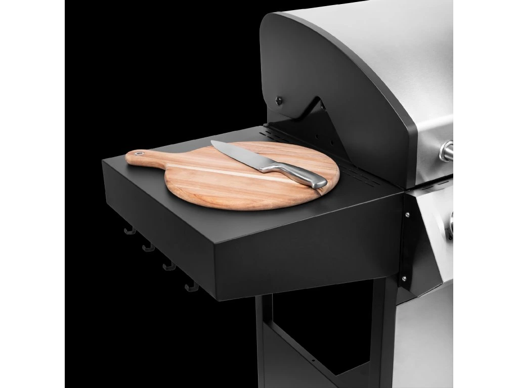 A Teesa BBQ 5007 MASTER grill nemcsak a grillezés erejét és kényelmét kínálja, hanem átgondolt szervezeti megoldásokat is. A gázpalack szekrény lehetővé teszi a gáz biztonságos és esztétikus tárolását, és a négy kampó megkönnyíti a tartozékok elérését. Így minden szükséges elem mindig kéznél van, növelve a használat kényelmét.