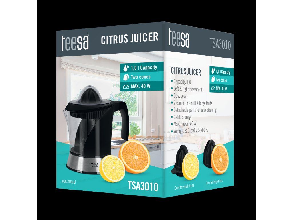 A Teesa TSA3010 citrusprés egy olyan termék, amelynek mindenkinek a háztartásában ott kell lennie, aki értékeli az egészséges táplálkozást. A 40 W maximális teljesítményű motor, a nagy vagy kis gyümölcsökhöz való változatban a tartozék két forgásiránya biztosítja bármely citrusféle precíz levesezését. A fekete burkolat csiszolt rozsdamentes acél elemekkel és az átlátszó gyümölcscentrifuga zónával a Teesa gyümölcscentrifugát nemcsak praktikus konyhai eszközzé, hanem elegáns dizájnelemmé is teszi. A porzáró fedélnek és a könnyű tisztításhoz levehető részeknek köszönhetően a készüléket nagyon könnyű tisztán tartani.