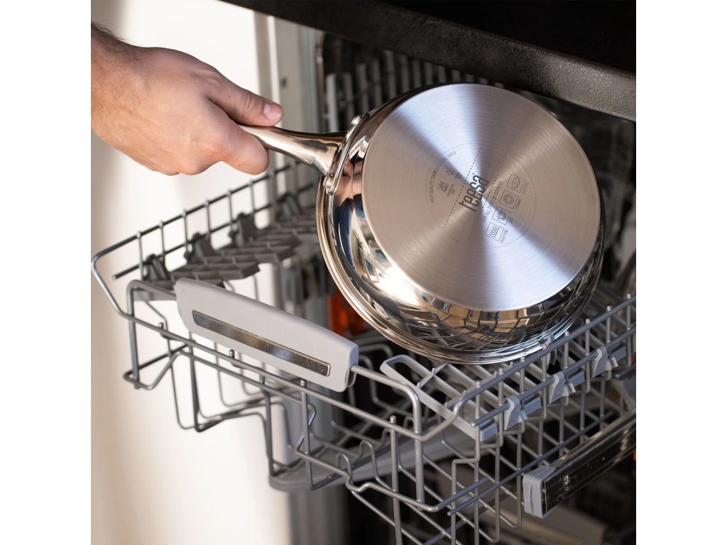 Ez a nagyméretű serpenyő a legmagasabb minőségű 18/10 rozsdamentes acélból készült, ami azt jelenti, hogy összetétele 18% krómot és 10% nikkelt tartalmaz. Ez utóbbi garantálja a kiváló korróziógátló tulajdonságokat és a tartósságot, a karcolásokkal, sérülésekkel és hővel szembeni ellenállást. Másrészt a nikkel jelenléte hozzájárul a termék esztétikus megjelenéséhez, mivel világosabb színt és fényt kölcsönöz a serpenyőnek.