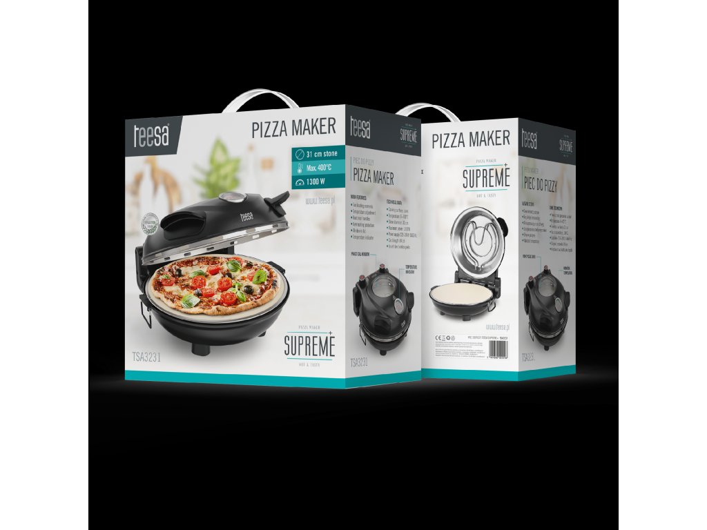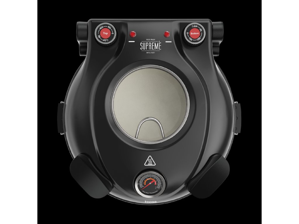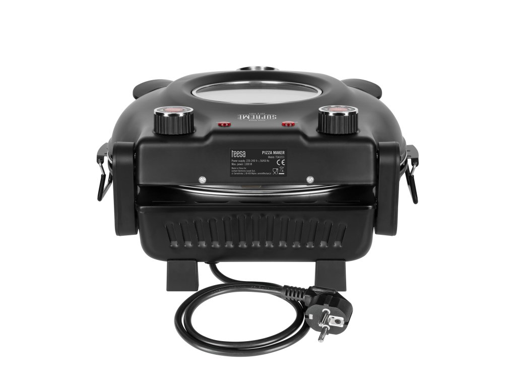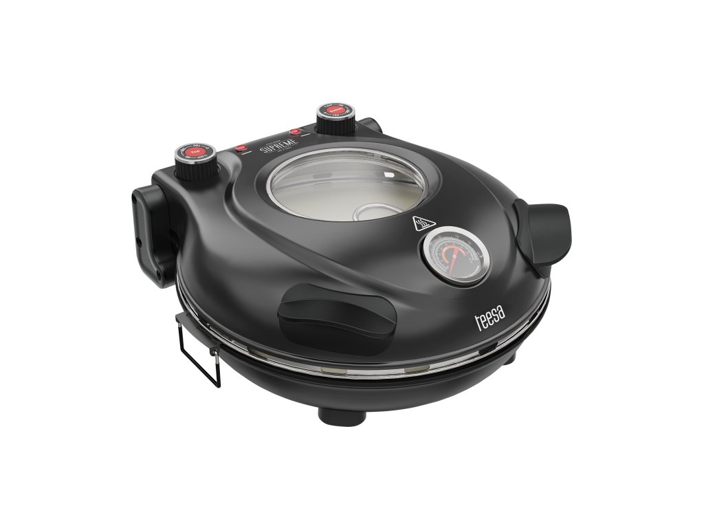 A Teesa Supreme otthoni pizzasütő fekete háza sokoldalúságot biztosít, így bármilyen konyhában használható. A fedelén lévő fogantyúk lehetővé teszik, hogy a sütő bármikor biztonságosan kinyitható legyen sütés közben .A készlethez mellékelt két acél spatulának köszönhetően a házi pizza viszont gyorsan és biztonságosan landol az otthoni tányéron.