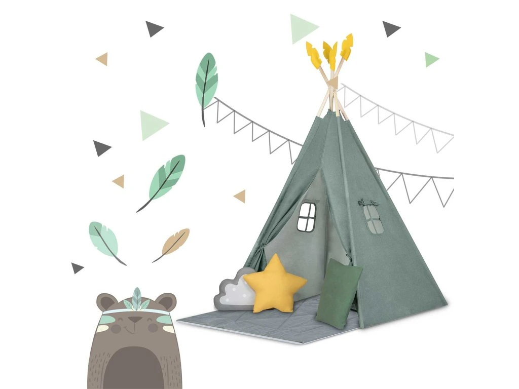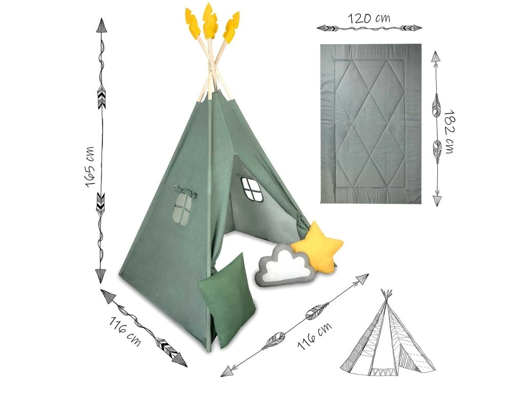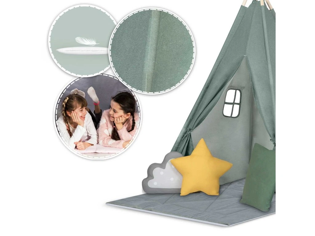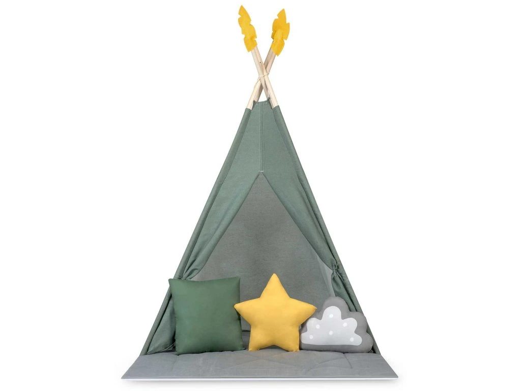 Minden egyes teepee a képen látható3 párnából álló készletettartalmazza (négyzet, csillag és puff)!