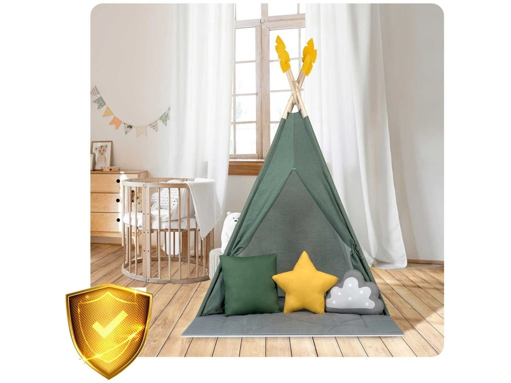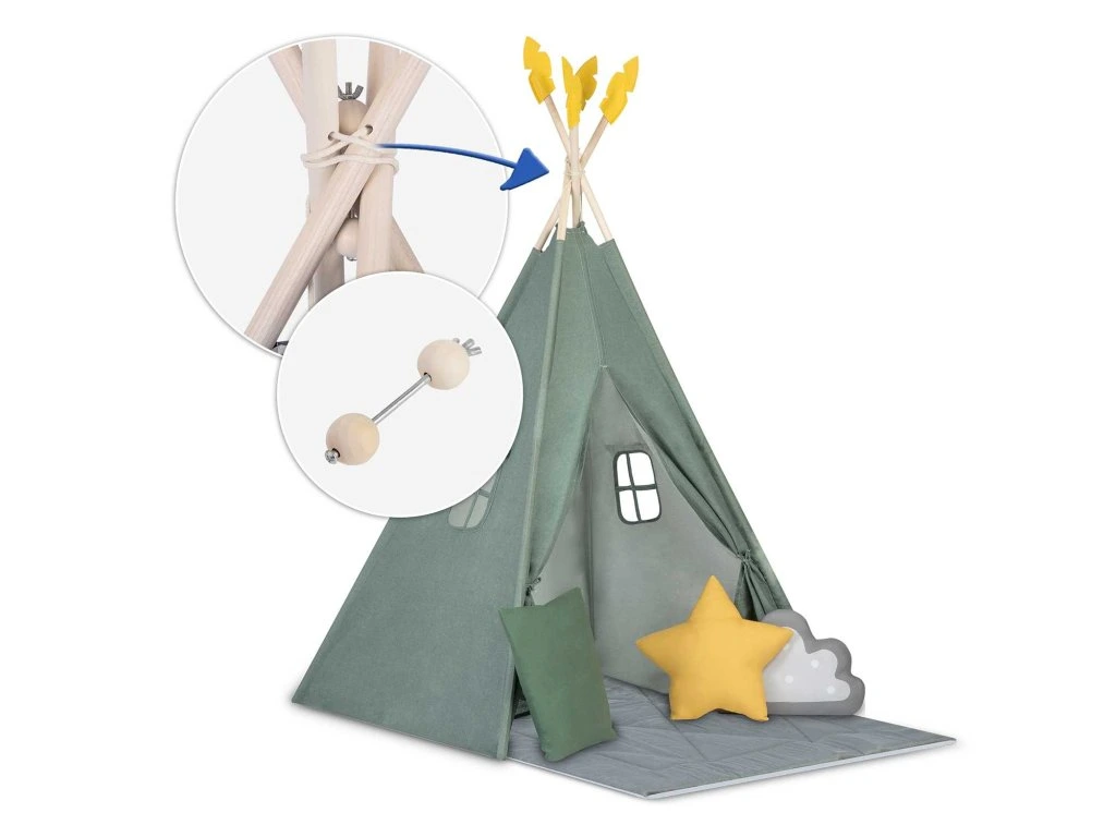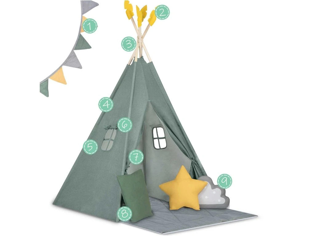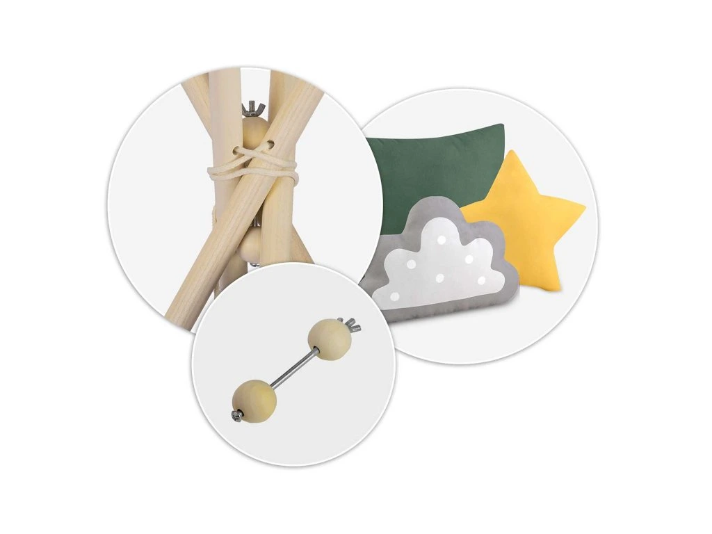 Minden egyes teepee a képen látható3 párnából álló készletettartalmazza (négyzet, csillag és puff)!