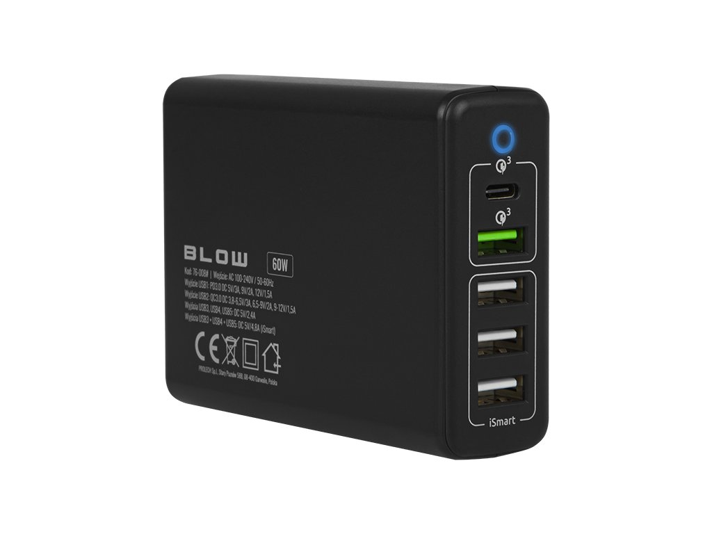 Fali töltő négy USB-csatlakozóval és egy USB-C porttal. A töltő olyan eszközökhöz készült, amelyek USB-ről és USB-C-ről táplálhatók/tölthetők. A SMART funkció maga állítja be a biztonságos feszültséget és állítja be a maximális töltési sebességet.