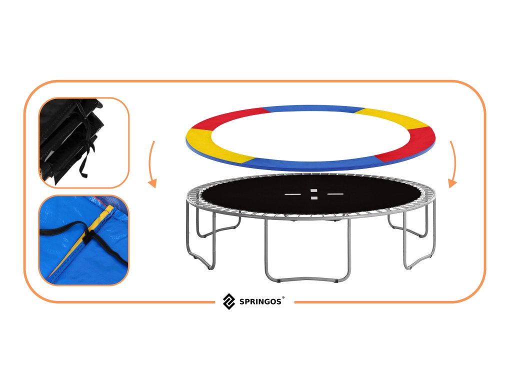 Tartós trambulinrugó-védelem kiváló minőségű szintetikus anyagból készült, amely magas biztonságot garantál használat közben. Az anyagok magas minősége tartós használatot garantál. A védelem univerzális méretekkel rendelkezik, és különböző márkák 300/305/312 cm (10FT) átmérőjű trambulinjaihoz illik. Illik mind belső, mind külső hálós trambulinokhoz. A burkolat 3 rétegű technológiával készült.