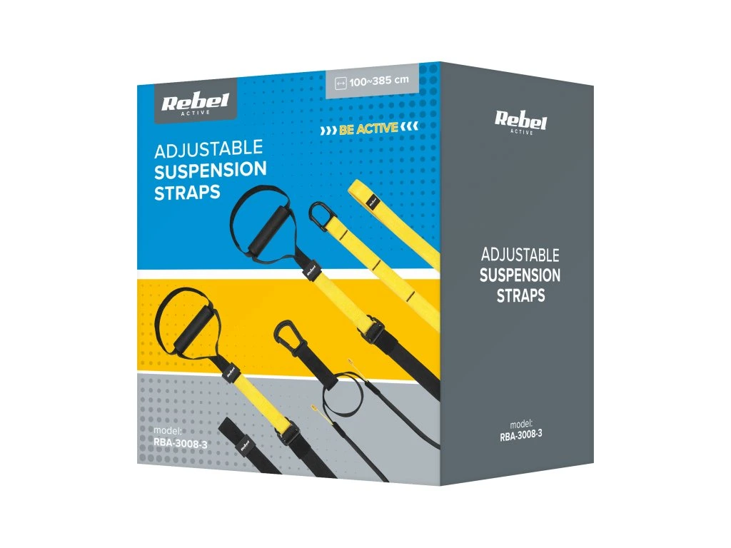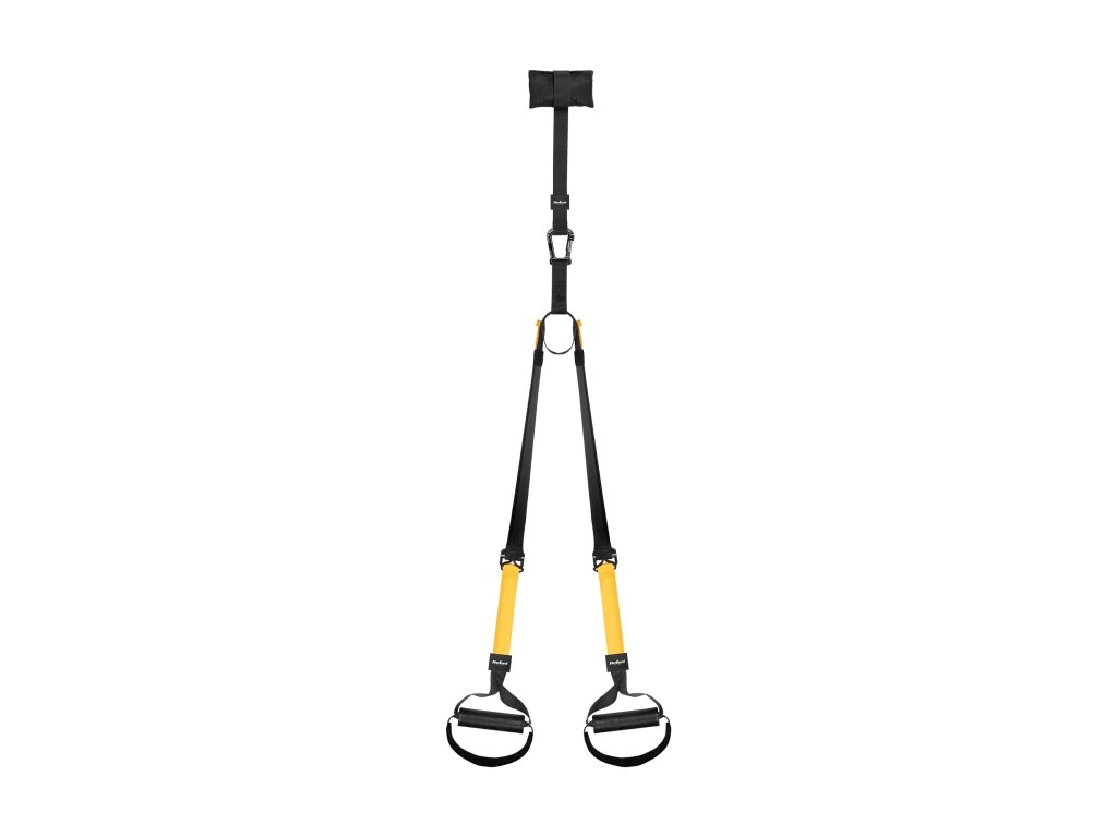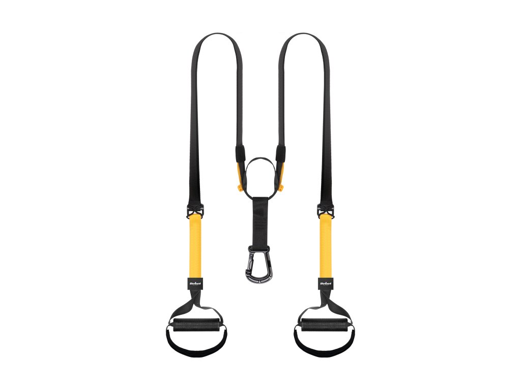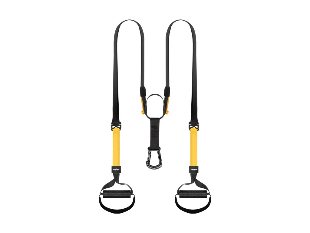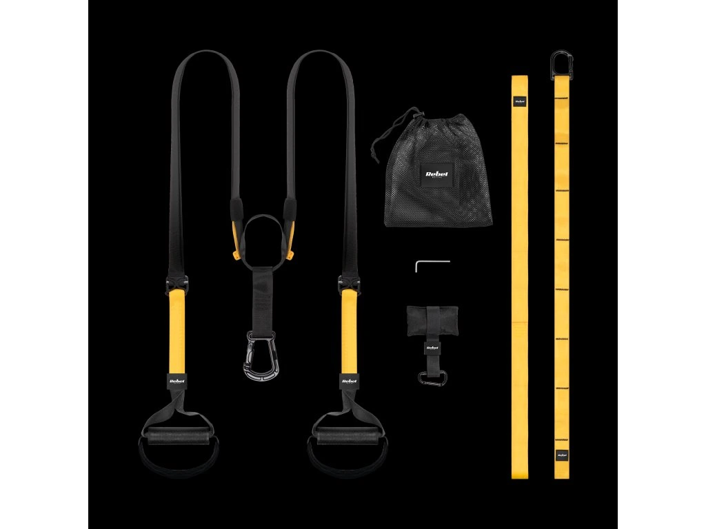 A készlet tartalma: 1x szalag, 1x hosszabbító szalag karabinerrel (90 cm), 1x segéd szalag (95 cm), 1x ajtókar (35 cm), tárolótáska