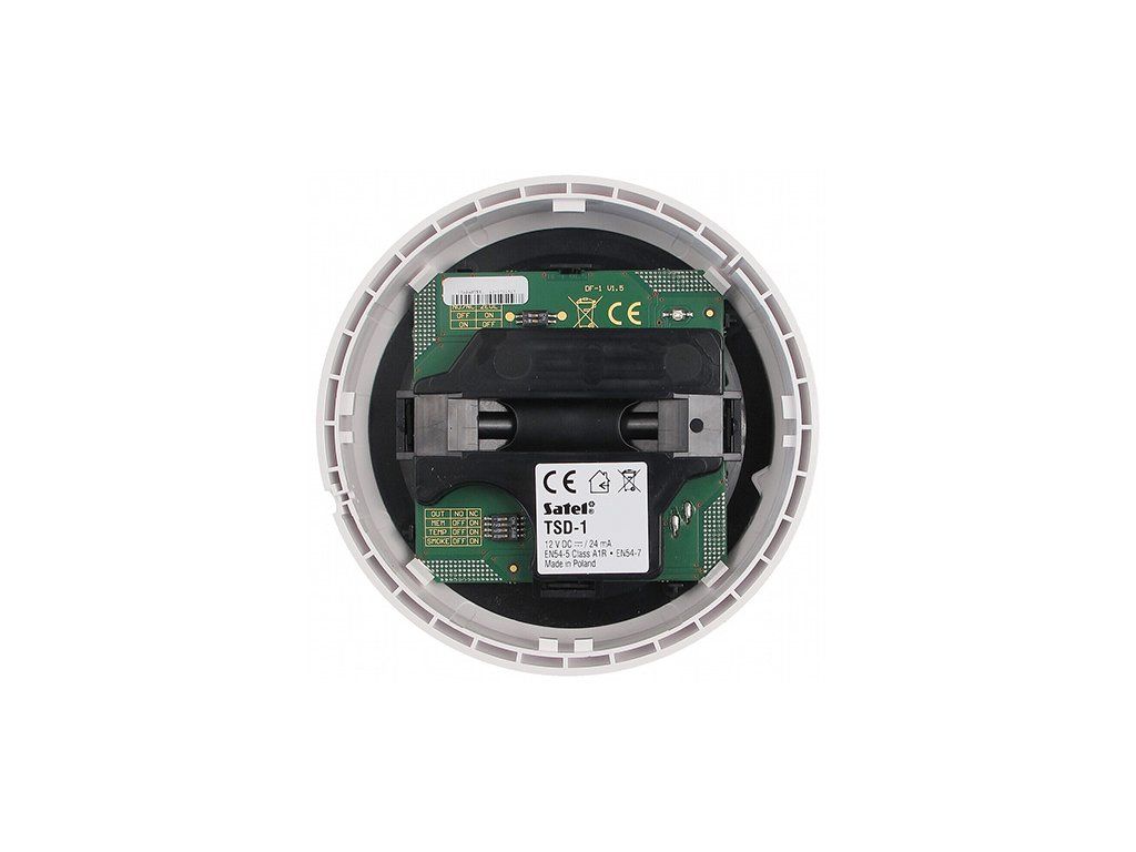 Füst- és hőérzékelő riasztórendszerekhez (12V) TSD-1 a SATEL-től a tűz korai stádiumú észlelésére készült. A SATEL TSD-1 érzékelő fényelektromos látható füstérzékelővel és egy túlzottan deriváló hőérzékelővel van felszerelve. A mérőkamra kialakítása biztosítja a magas érzékenységet és a direkten áramlástalanítást, továbbá a pontos Hexamesh szűrő rozsdamentes acélból megakadályozza a szennyeződések bejutását a belsejébe. Az érzékelő konfigurációja és a beépített paraméteres végsor ellenállások megkönnyítik a TSD-1 füst- és hőérzékelő csatlakoztatását szinte bármely 12V-os riasztóközponthoz.
