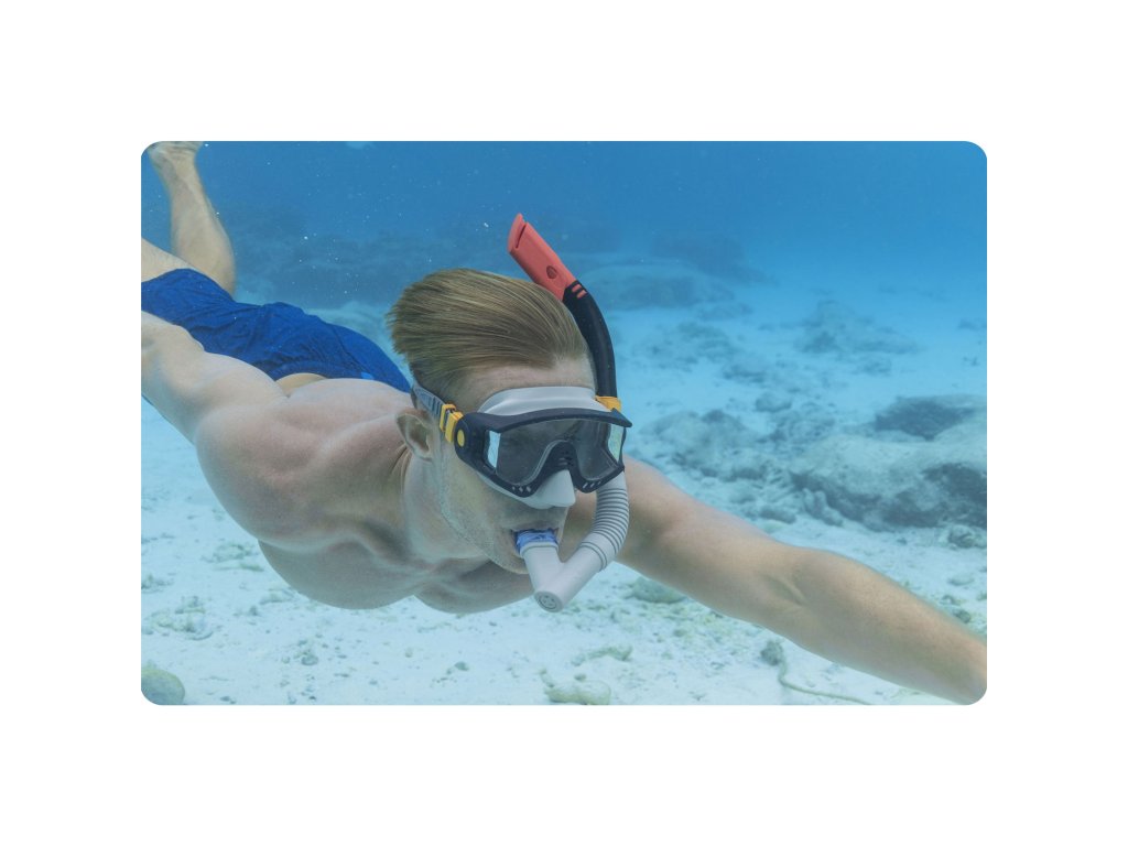 A készlet tartalmaz egy csövet is, amin keresztül lélegezhetsz, miközben a víz alatt úszol. A szilikon szájrész az ajkak formájához igazodik, és a speciális fedél megakadályozza a víz bejutását.