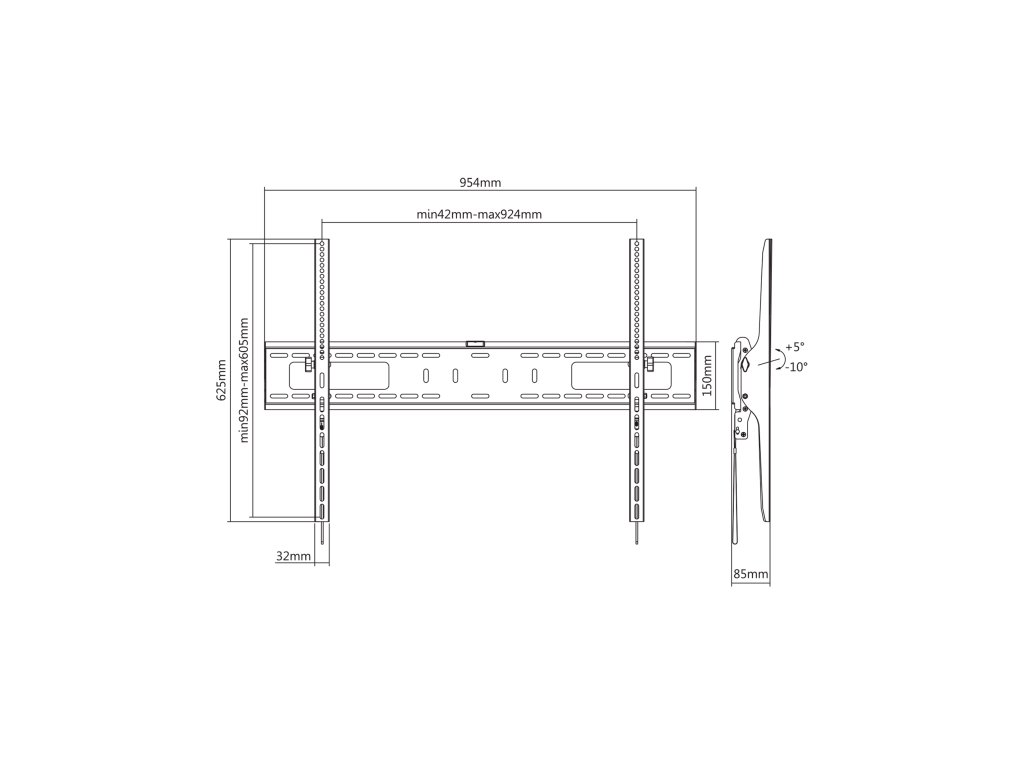 Maximális terhelés: 75 kg (165 lbs) VESA szabvány: 200x200, 300x200, 300x300, 400x200, 400x300, 400x400, 600x400, 600x600, 800x600, 900x600 Függőleges beállítás: +5° / -10° Faltól való távolság: 85 mm Vízszint: