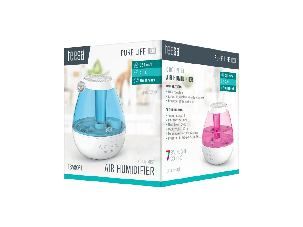 A Teesa elektromos párásító másik előnye a háttérvilágítás színének megválasztása. Biztos lehet benne, hogy olyan színt választ, amellyel a készülék tökéletesen illeszkedik a szoba berendezéséhez, amelyben található.
