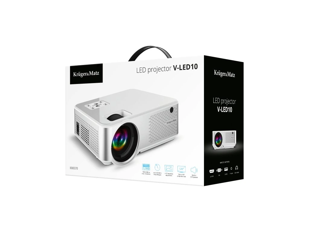 Úgy gondolja, hogy egy 65 hüvelykes tévé sok? A Kruger&Matz V-LED10 projektorral akár 120" képátlójú képeket is kivetíthet. Ez majdnem kétszer akkora! Mostantól minden filmnél úgy érezheti magát, mintha moziban lenne.