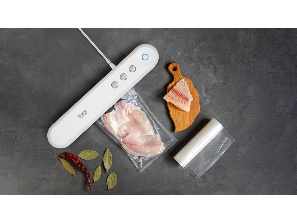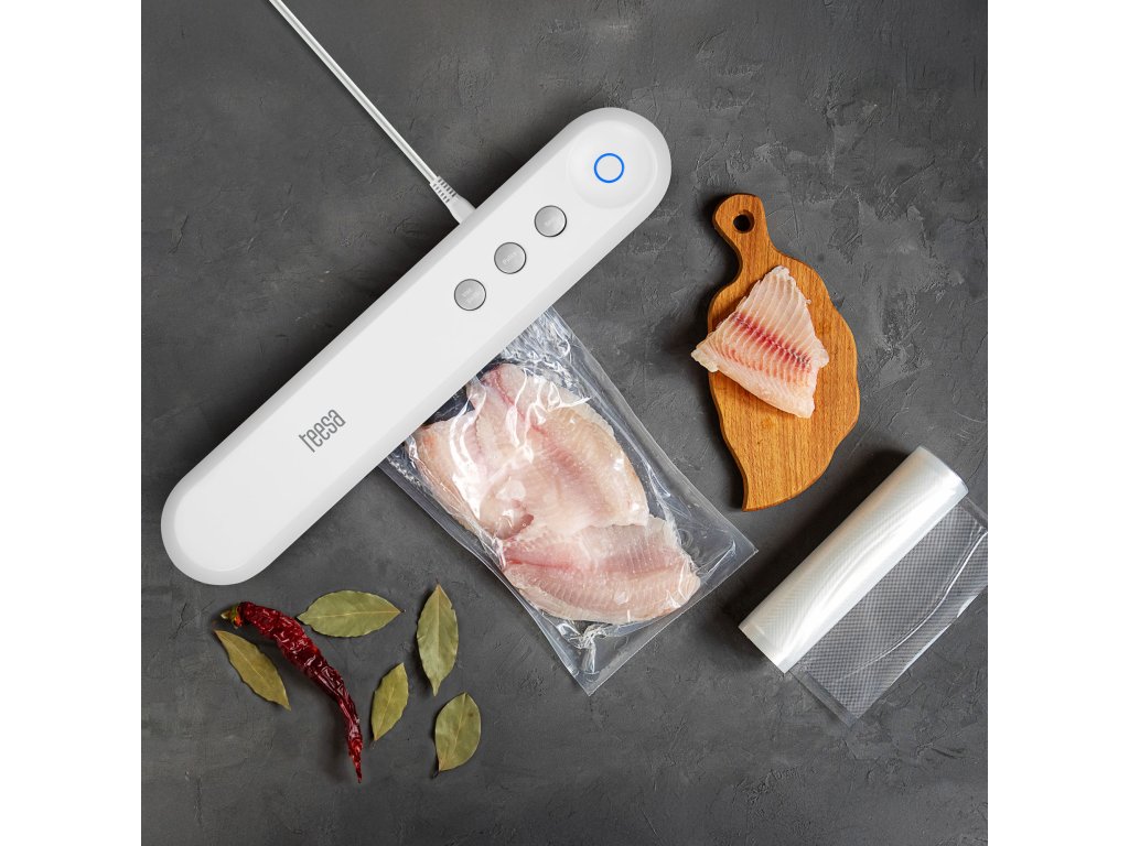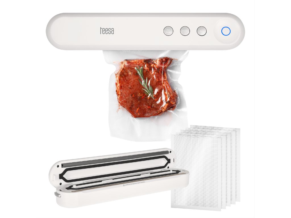 A Teesa V100 vákuumcsomagoló elengedhetetlen eszköz minden konyhában. Tökéletesen alkalmas ételek csomagolására, nedvességtől való megóvásra, fagyasztására vagy sous-vide módszerrel történő előkészítésre. Ideális megoldás azok számára, akik értékelik a frissességet, a takarékosságot és a rendet a hűtőszekrényben vagy fagyasztóban.