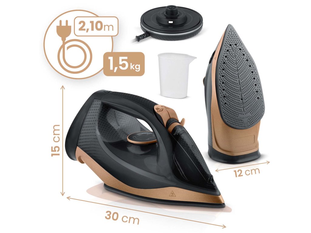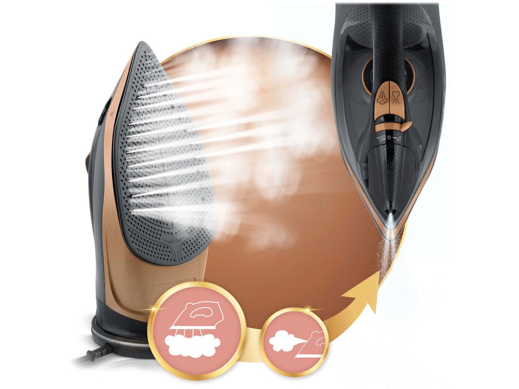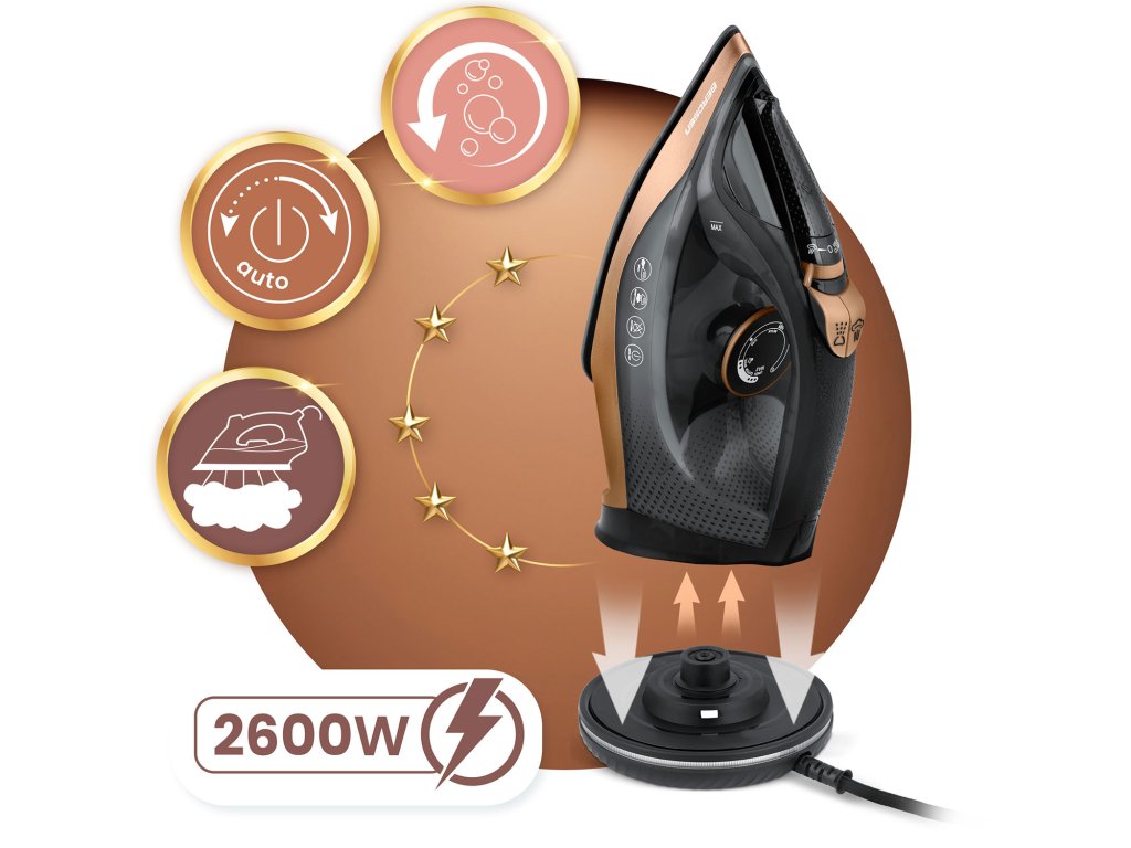 AKÁR 2600 W TELJESÍTMÉNY | ÖNTISZTÍTÁS | TÚLMELEGEDÉS ELLENI VÉDELEM | 320 ML-ES VÍZTARTÁLY | FÜGGŐLEGES GŐZ | HŐMÉRSÉKLET SZABÁLYOZÁS | AUTOMATA LEKAPCSOLÁS | PERMETEZŐ | TÖLTŐALAP
