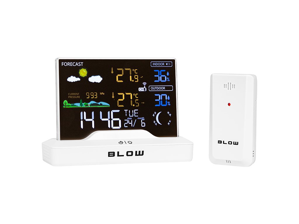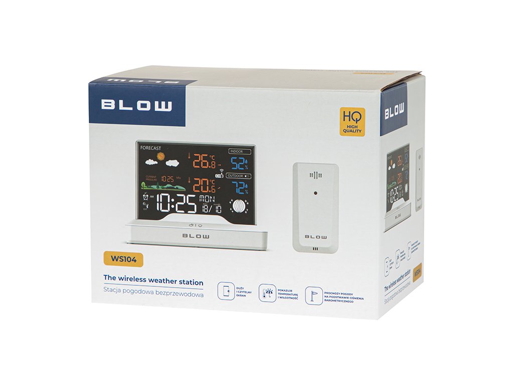 Az alapvető funkciókon kívül a BLOW WS104 állomás barométert, időjárás-előrejelzést és riasztási funkciót is kínál. Az aktuális légnyomással kapcsolatos információk jobb szabadtéri tervezést tesznek lehetővé. A beépített memória rögzíti a maximális és minimális hőmérsékletet és páratartalmat, ami lehetővé teszi a változások időbeli monitorozását. Az óra funkció 12/24 órás formátummal és a hét napjainak kijelzésével univerzális kiegészítővé teszi ezt a készüléket minden otthon számára.