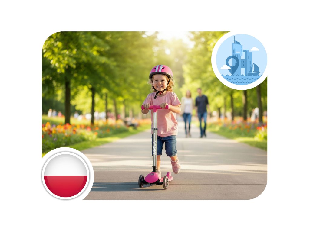 A kormányzás kizárólag testhelyzet-változtatással történik, a kormány elfordítása nélkül. Elég kissé az kívánt irányba hajolni, és máris! A gyerek gyorsan elsajátítja ezt a vezetési technikát, és ezáltal gyakorolja az egyensúlyérzékét. A roller, kanyarodáskor, stabilan tartja magát függőlegesen a három keréknek köszönhetően.