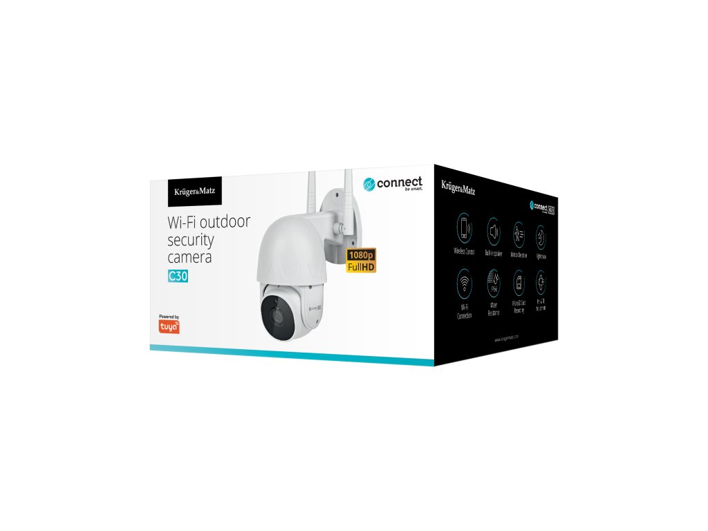 A Kruger&Matz Connect C30 vezeték nélküli kamera tökéletes kiegészítője az intelligens otthoni eszközének. A Wi-Fi kapcsolatnak köszönhetően a készülék a TuyaSmart alkalmazással vezérelhető, így bárhol is tartózkodik, bármikor ellenőrizheti, mi történik a hátsó kertjében.