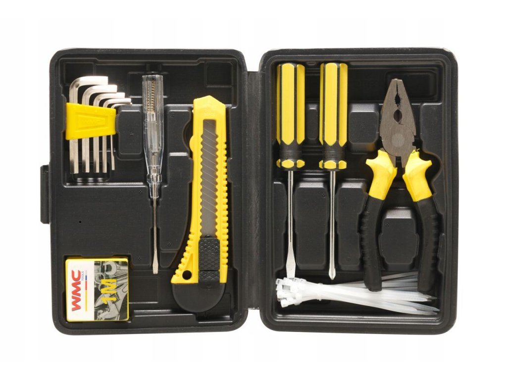 Gondosan válogatott választék magában foglalja a csavarhúzókat, kulcsokat, fogókat és kést, valamint hasznos kiegészítőket: műanyag bilincsek, mérőszalag és feszültségmérő funkcióval rendelkező csavarhúzó. Az egész készlet egy masszív táskába van csomagolva, amely lehetővé teszi a könnyű tárolást és szállítást.