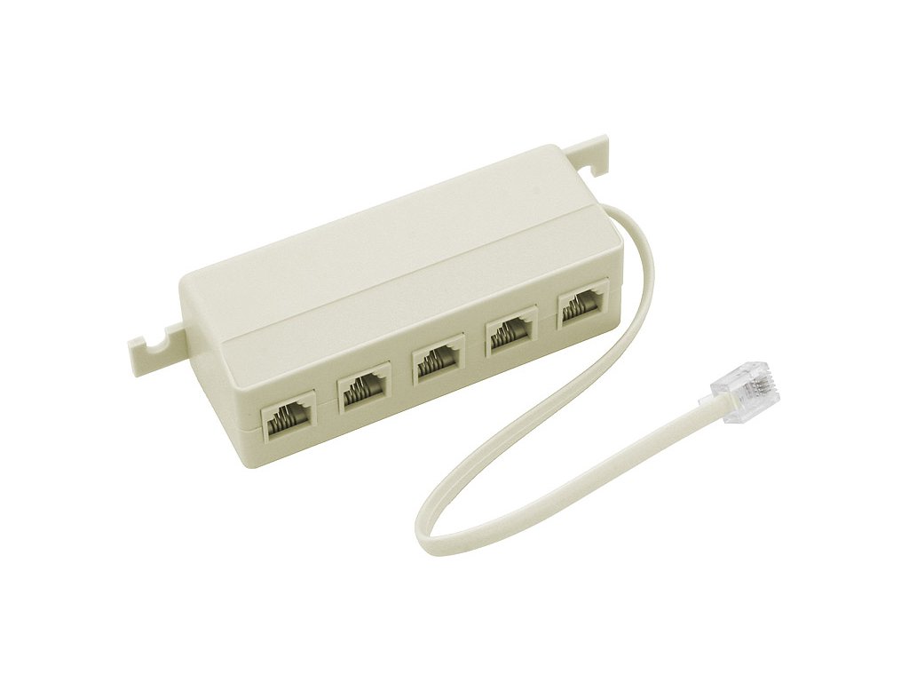 Telefonelosztó kapcsokkal, egy dugóval a kábelen és öt 6P4C (RJ14) aljzattal.