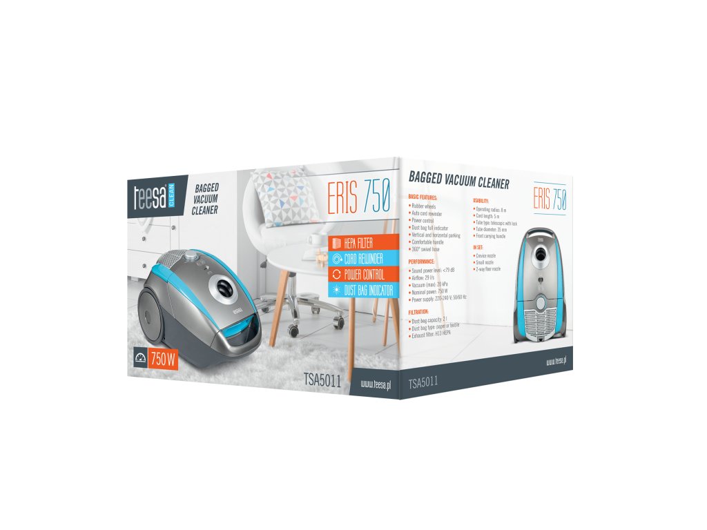 A TEESA ERIS 750 egy kicsi és könnyű zsebporszívó, amely 750 W-os teljesítményével segít a mindennapi takarításban. A kényelmes függőleges és vízszintes parkolási rendszer, valamint a hosszabbítózárral ellátott teleszkópos cső nagyszerű takarítási kényelmet biztosít. A teljesítményszabályozó gombnak köszönhetően bármilyen felületet gond nélkül porszívózhat. Még inkább, ha a további fúvókákat - a résfúvókát, a nagy kétfokozatú fúvókát és a kis fúvókát parkettapárnával - is hozzáadja. Ráadásul, ha a zsák kezd túlcsordulni, egy speciális kijelző tudatja Önnel, hogy mikor kell kicserélni.