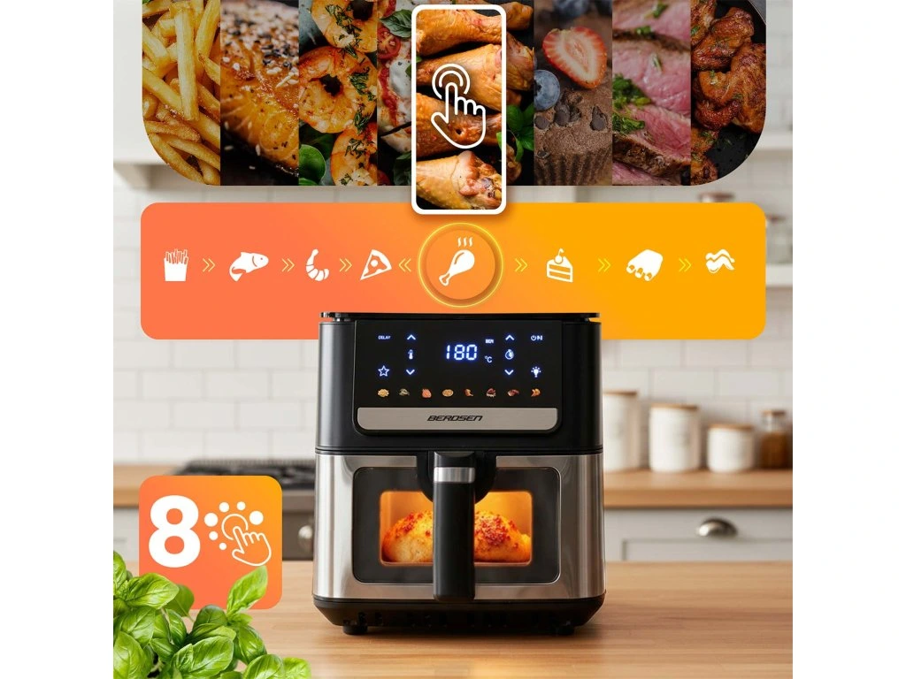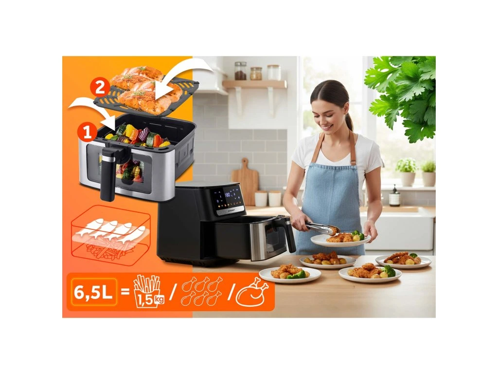 A BD-655 multifunkcionális konyhai eszköz, amely nem csak forró levegőn süt, hanem süt, grillezi, sőt szárít is. Egy eszköz – végtelen lehetőségek: szaftos csirkétől a ropogós csirke szárnyakig, szárított gyümölcsökig és zöldségekig.