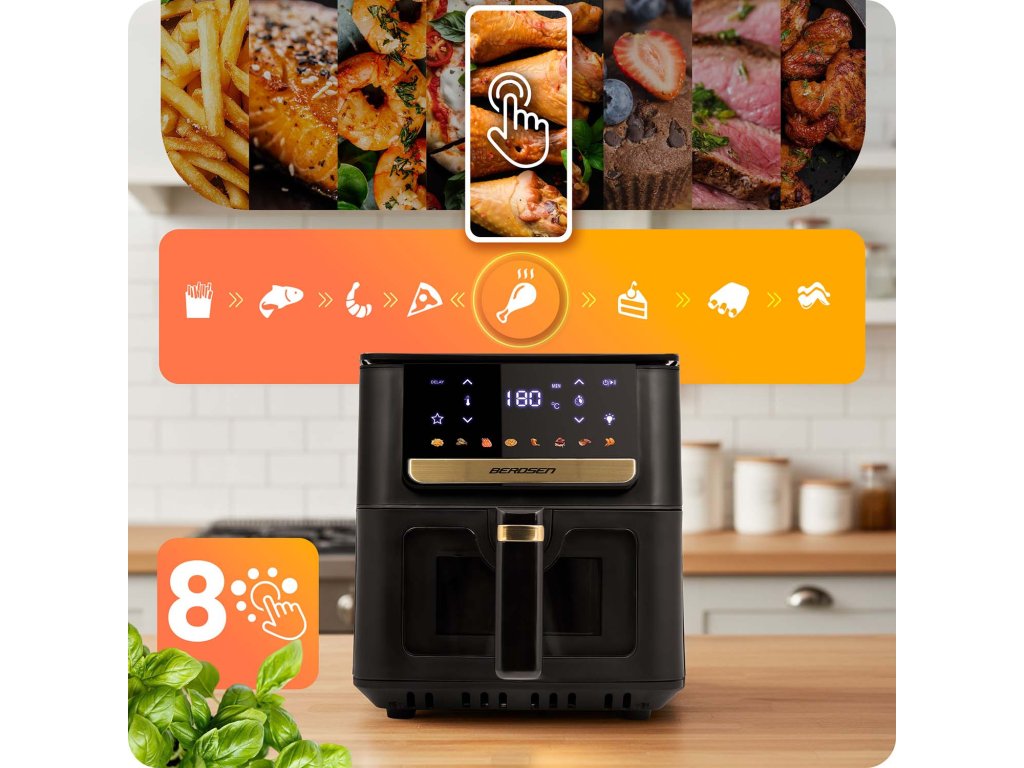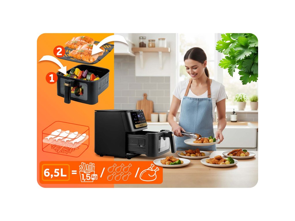 Tökéletesen ropogós hasábburgonyát, lédús csirkét vagy aranybarna zöldségeket érhetsz el anélkül, hogy több zsírt használnál, mint szükséges! A fejlett forró levegő cirkulációs technológiának köszönhetően a fritőz a sütési folyamat ideális eredményeit biztosítja: aranyszínű, enyhén ropogós bőr kívül és lédús belül. Ez egy ízletes, könnyű alternatíva az olajban való sütéshez — szag nélkül, fröccsenés nélkül és felesleges kalóriák nélkül.